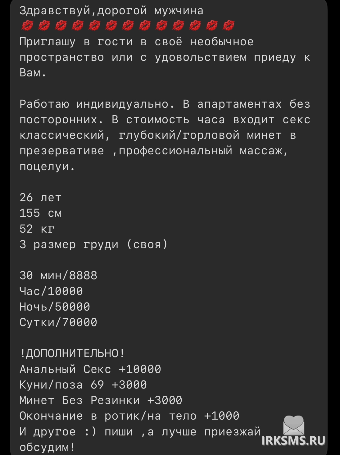 правильно зашли в раздел - здесь база всех самых доступных индивидуалок Иркутска.
