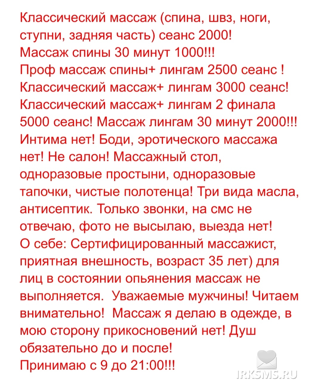 Уважаемые клиенты, встречайте мастера массажа с изысканным вкусом и мастерством! Я гарантирую вам незабываемый опыт и полное расслабление после сеанса. Доверьтесь профессионалу с опытом работы более 8 лет. Кабинеты оборудованы всем необходимым для Вашего комфорта, а душ доступен для вас до и после массажа. Пишите мне , не всегда есть возможность ответить 89645427201