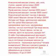 Люблю делать массаж. Массаж расслабляющий всего тела. Принимаю в кабинете в октябрьском районе. Только русских и адекватных. Цена 3000 за сеанс 1 час .Могу принять в "меру" выпившим с вином)) Читать внимательно, без тупых вопросов, какой массаж. Секса нет @blonda_fit